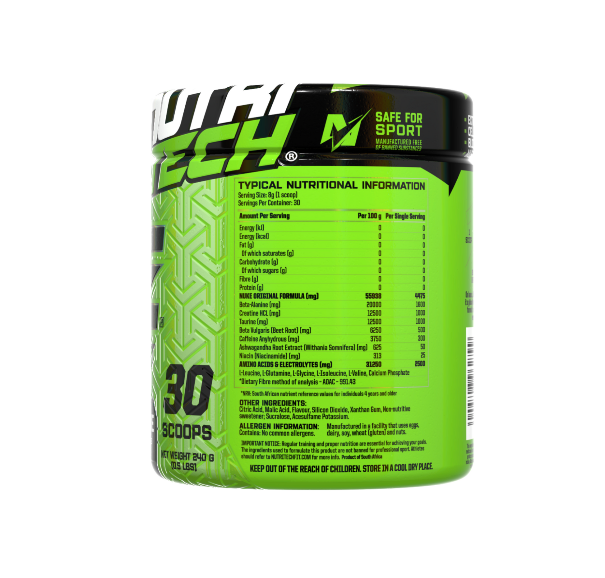 Nuke Original Pre-Workout is a powerful and effective pre-workout supplement designed to help you reach your fitness goals. It contains a blend of caffeine, taurine, creatine HCL, beta-alanine, and beetroot extract, to help you maximize your energy, focus, and performance during your workouts.
